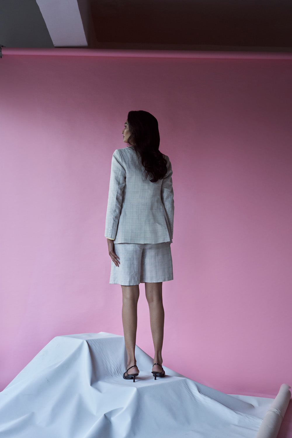 Adorned with an elegant checkered pattern, this sophisticated set in European linen features notch lapels, a two-button single breasted font, and flap pockets. Comes with single front pleated mom shorts to elevate your style quotient.