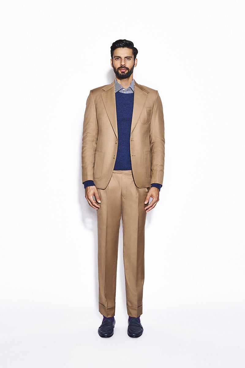 Lightweight, breathable, with pleated patch pocket details on the jacket and a two button closure. The trousers are high waisted and double pleated. Regular trousers can also be made for the same.
