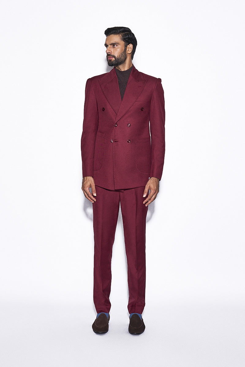 Our six button classic double breasted jacket merges impeccable crafting with a worsted Italian wool fabric. Wide peak lapels and hand-sewn natural shoulders distinguish the jacket which comes with patch pocket detail and pick stitching. Paired with high-waist single pleat trousers.