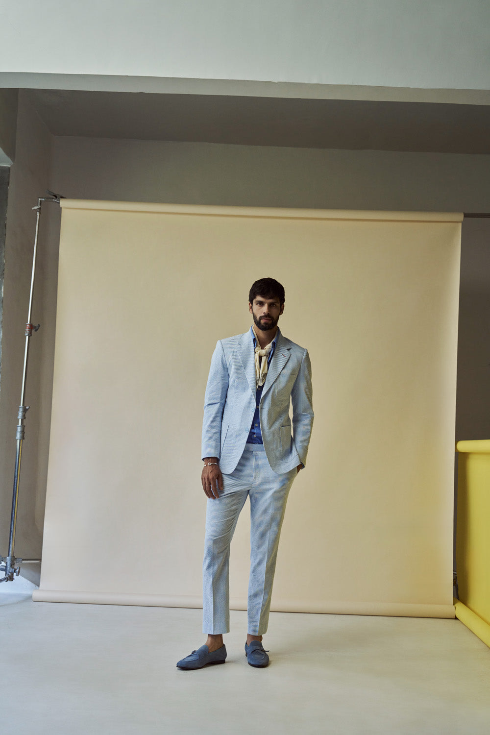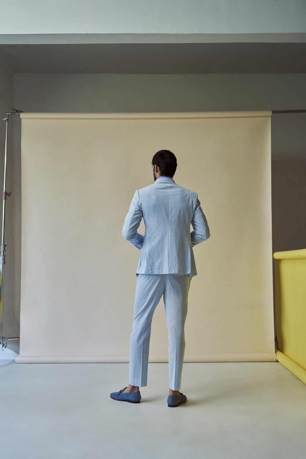 Our seersucker suit puts a modern spin on classic preppy style. The suit jacket features a modern slim fit, notched lapels, and distinctive patch pockets, adding a touch of relaxed elegance to its sophisticated design. A two-button closure and double vents provide a streamlined look and ease of movement, while the completely unlined construction ensures maximum breathability and comfort.